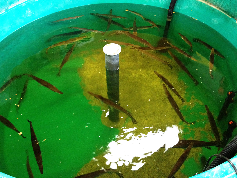 -In preparation for our upcoming aquaculture experiments using Cuban gars (Atractosteus tristoechus) to evaluate sustainable feed, different filtration systems, and various water quality parameters, we had to condition the fish to a variety of feed types.  Here you can see a brief video* of the Cuban gars which have been conditioned to take pellet feed (in this case New Life Spectrum fish food).