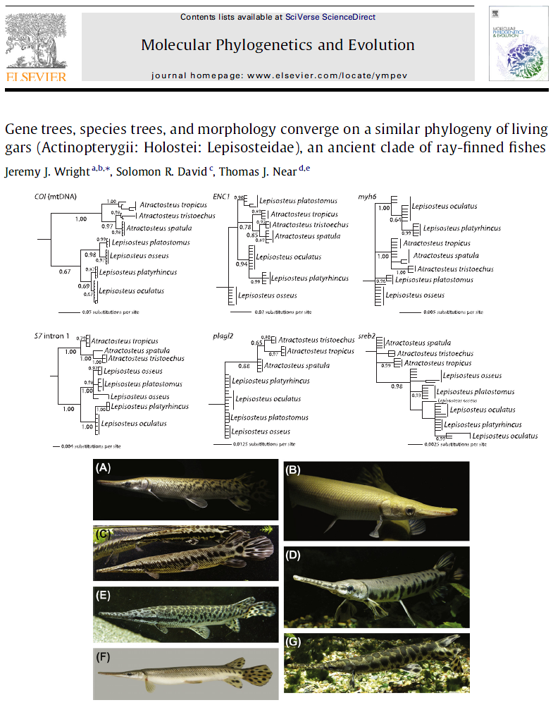 The first complete molecular phylogeny of living gars (Lepisosteidae) was published in the June 2012 issue of Molecular Phylogenetics and Evolution.  Abstract and table/figure summaries are available HERE.  Researchers and others interested in the full article please contact me at solomon.r.david@gmail.com.  Many thanks to all involved with completing this important analysis!